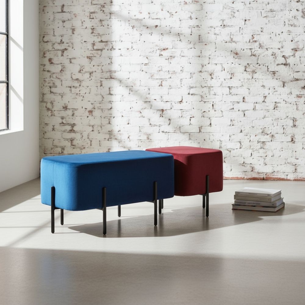 Upholstered ottoman made from high density foam, featuring steel legs, available in various powder coat finishes. Two sizes available.