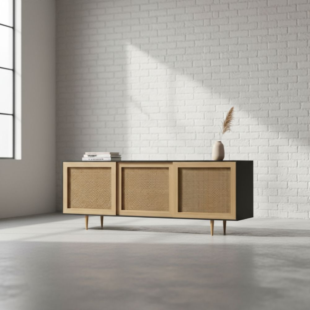 The Compact Server features solid oak soft-close doors with rattan inlay, solid oak legs with non-marking glides, and adjustable shelves with a hanging rail for adaptable storage. It includes knurled solid brass knobs, Hafele hardware, and a durable Osmo 2K oil finish for a smooth, natural surface.