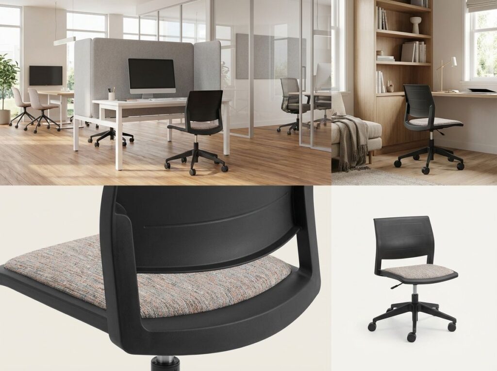 5 Star Black nylon Castor base with swivel and gas lift. Polypropylene backrest with Upholstered seat.