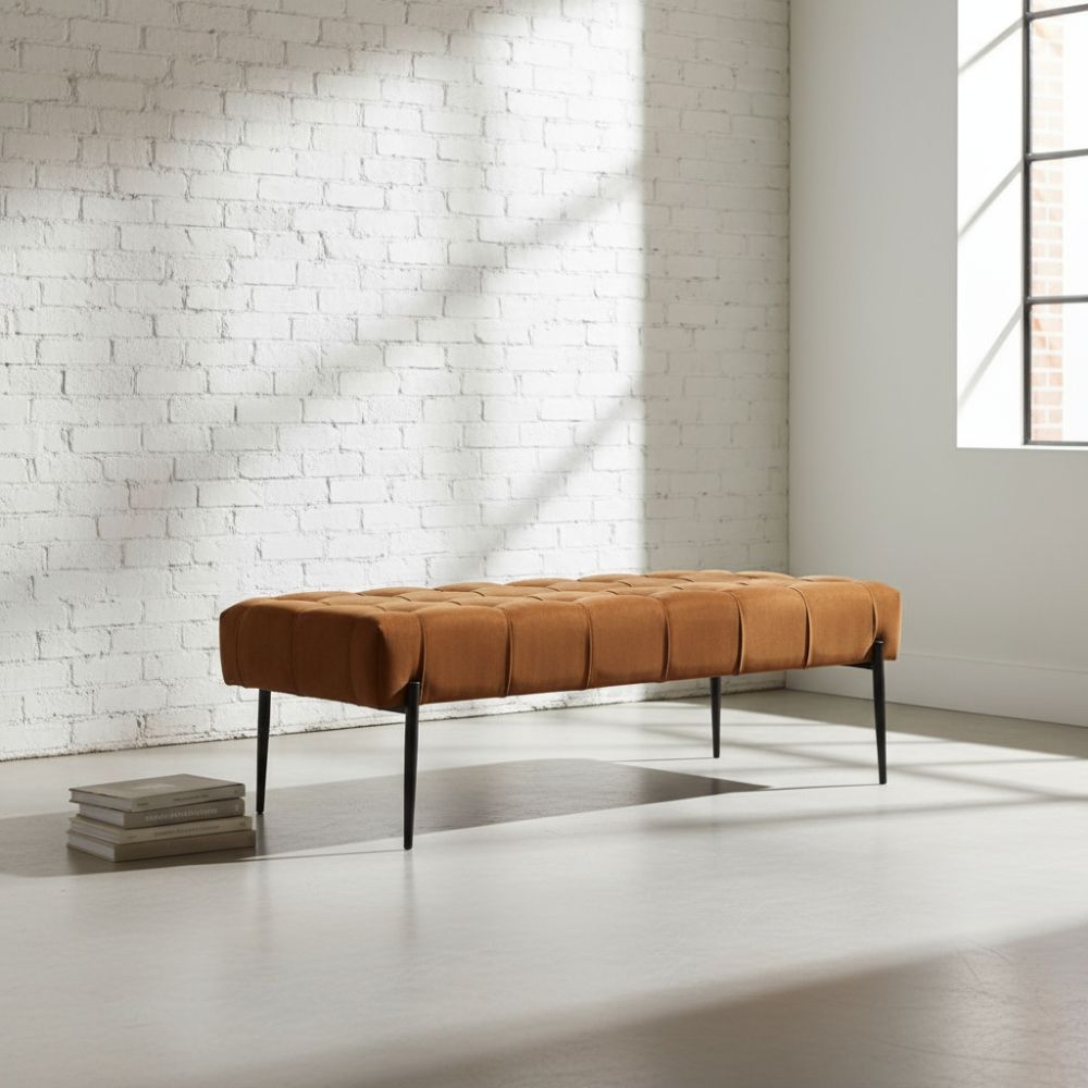 This retro two-seat bench ottoman makes a welcome addition to any interior. Fully upholstered with line detail and tapered steel legs available in a variety of powder coat finishes. Available with and without the table.