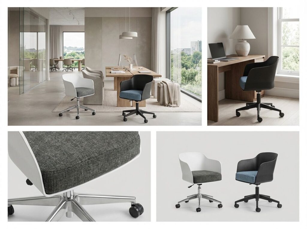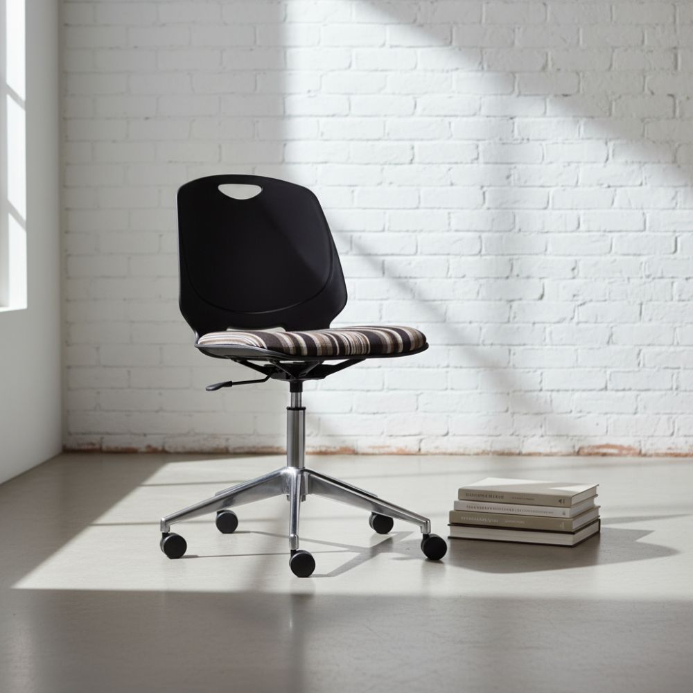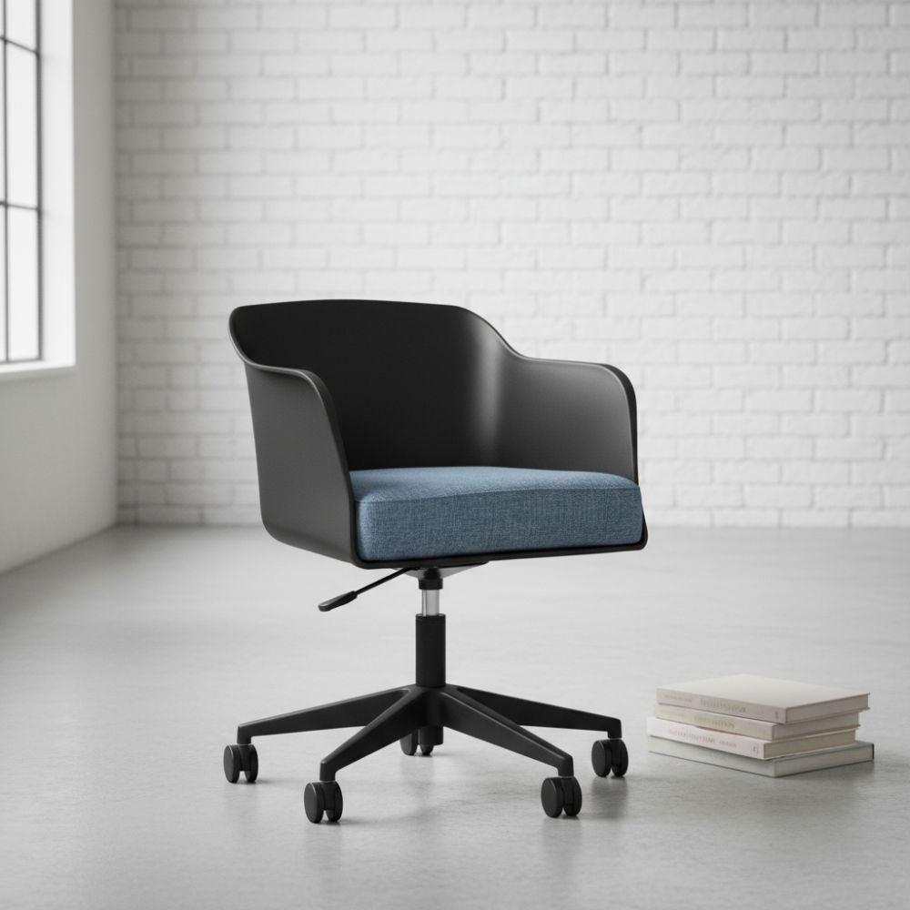Armchair comprising polyprop shell with fixed upholstered seat on choice of polished Aluminium or Black Nylon five star castor base with gas height adjustment.