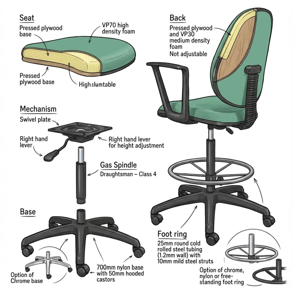 Base: 700mm Nylon base with 50mm hooded castors. Option of Chrome base.