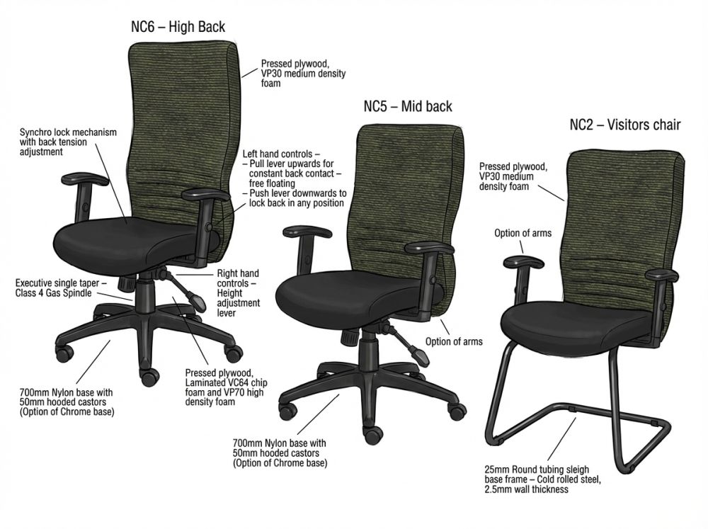 Seat: Pressed plywood. Laminated VC64 chip foam and VP70 high density foam.