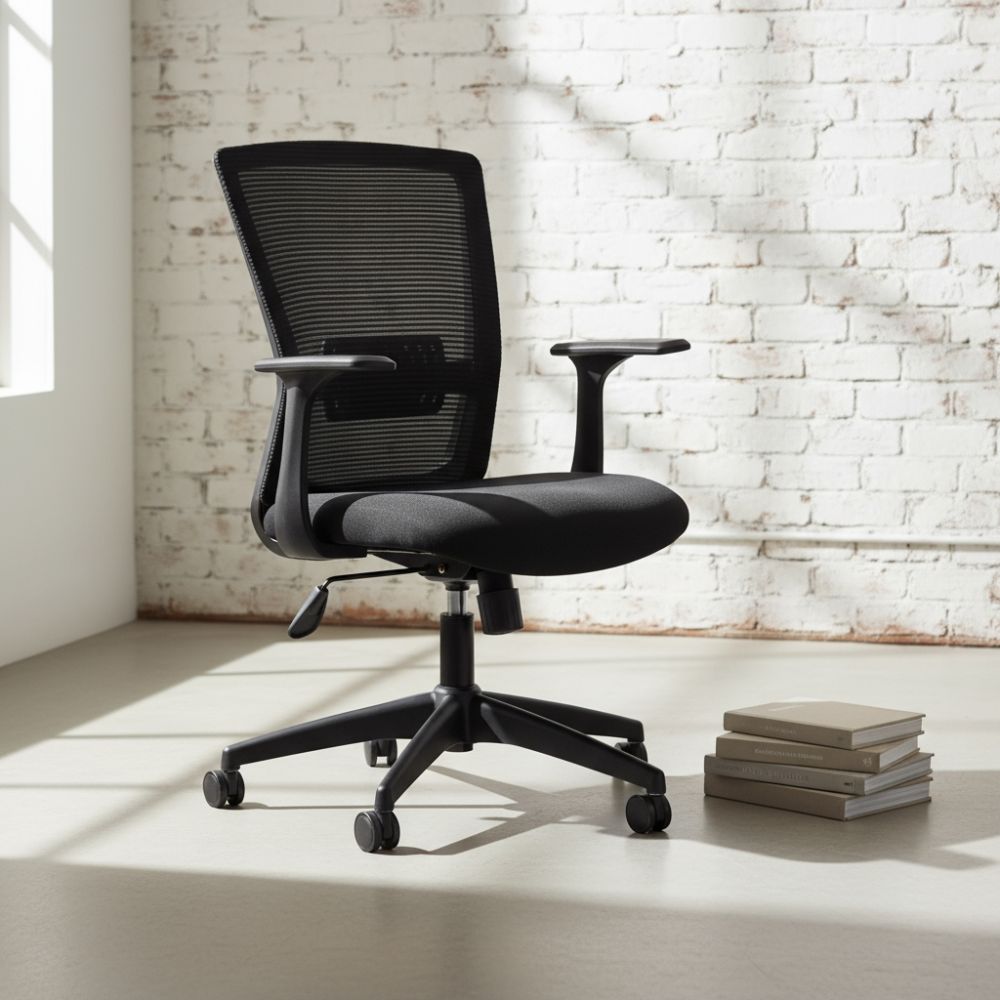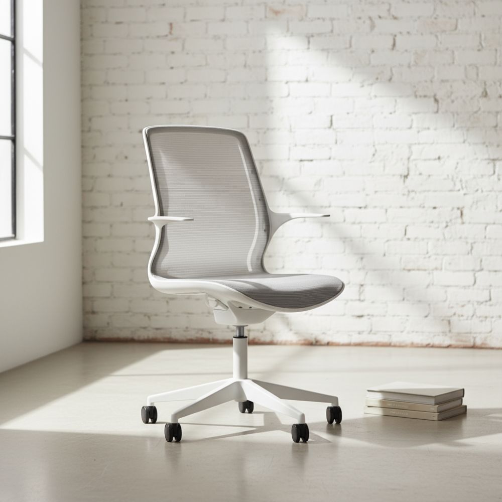 Ergonomic task chair comprising nylon shell structure with mesh insert on 5 star castor base with gas lift and locable tilt mechanism. Choice of Black with Black mesh or White with Grey mesh