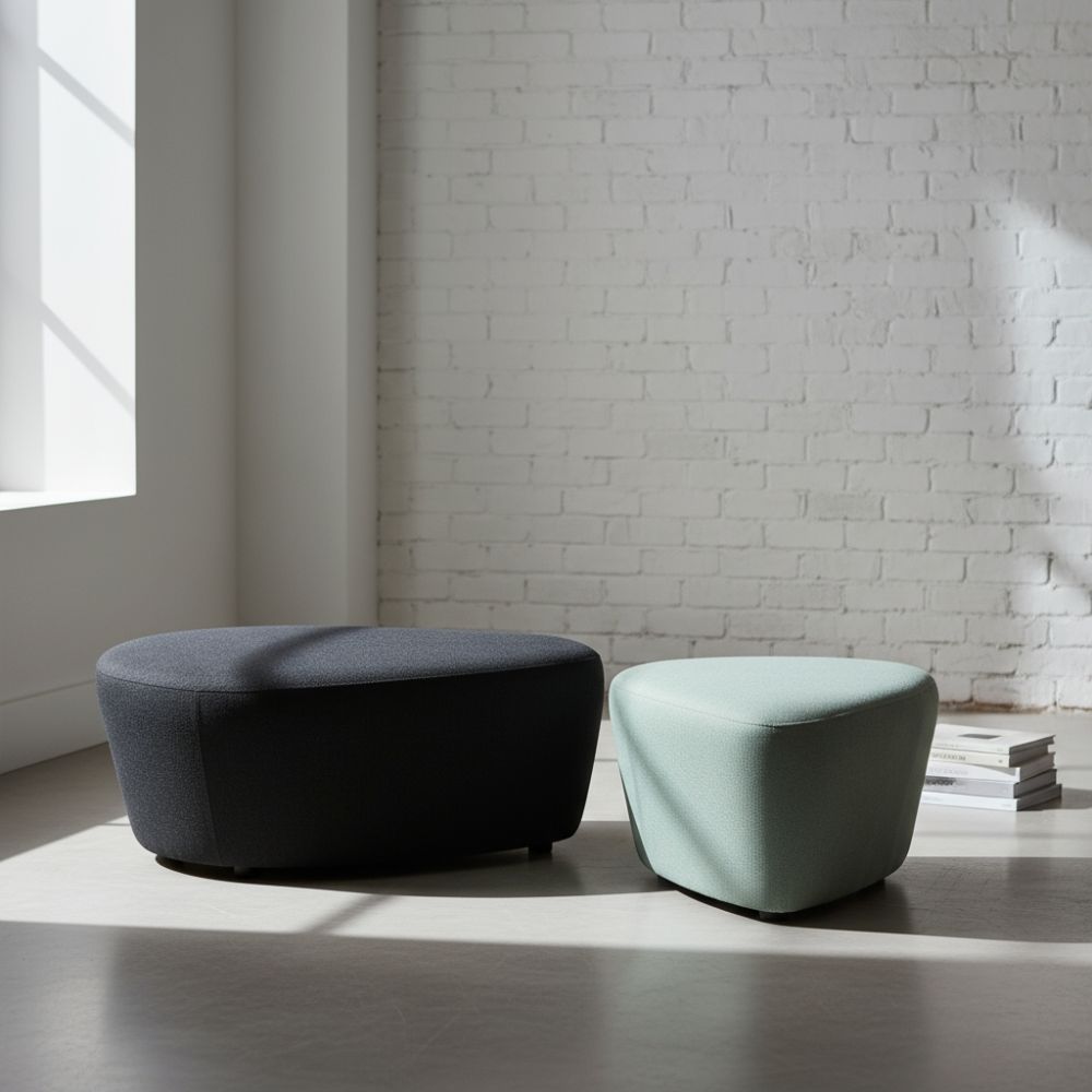 Two-tone upholstered ottoman set. The large ottoman features a recessed leg for easy maneuvering and a pop of height off the floor surface. The Shuttle Bot is on castors.