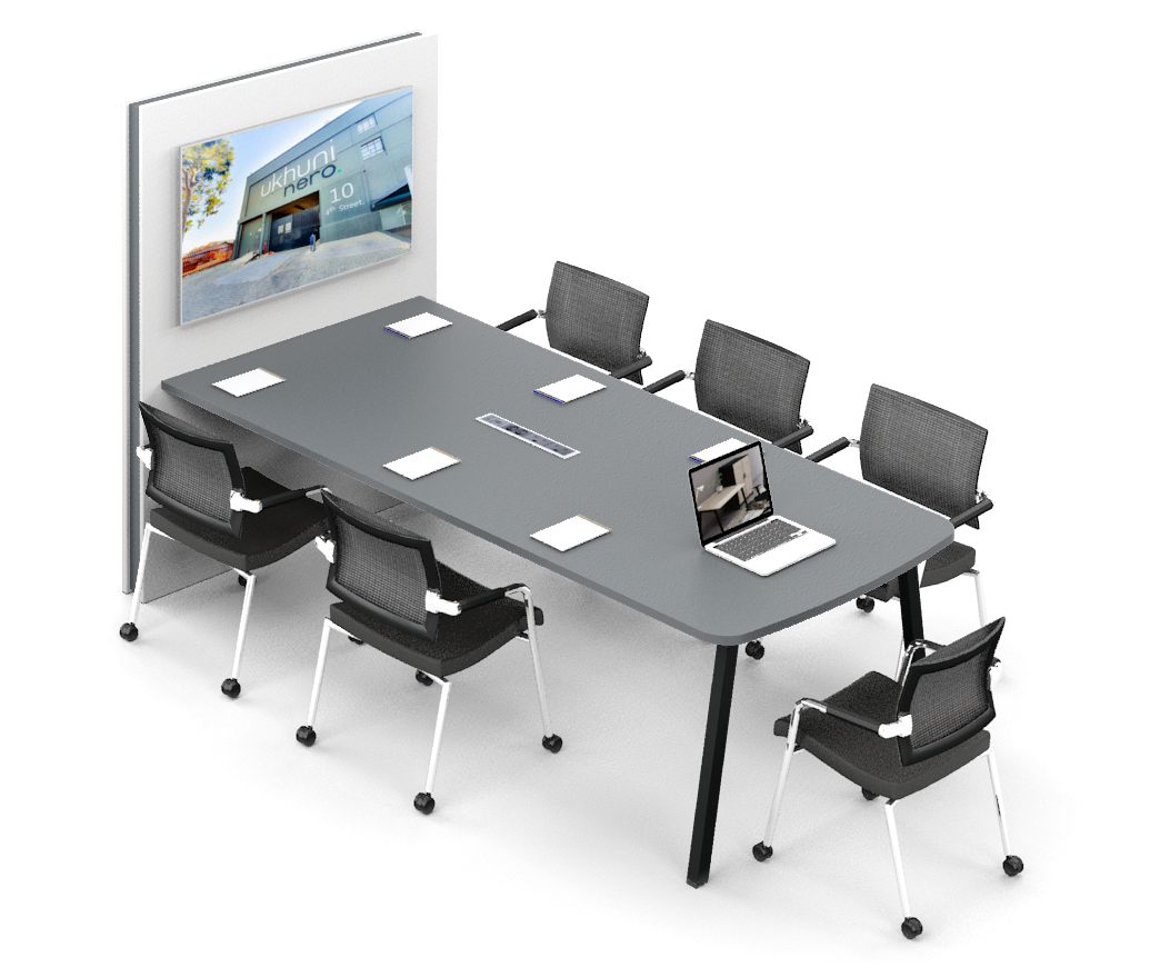 For a more formal collaborative setting, pair a Simply low table with Simply angled legs, attached to a media wall on one end that can accommodate a larger screen.