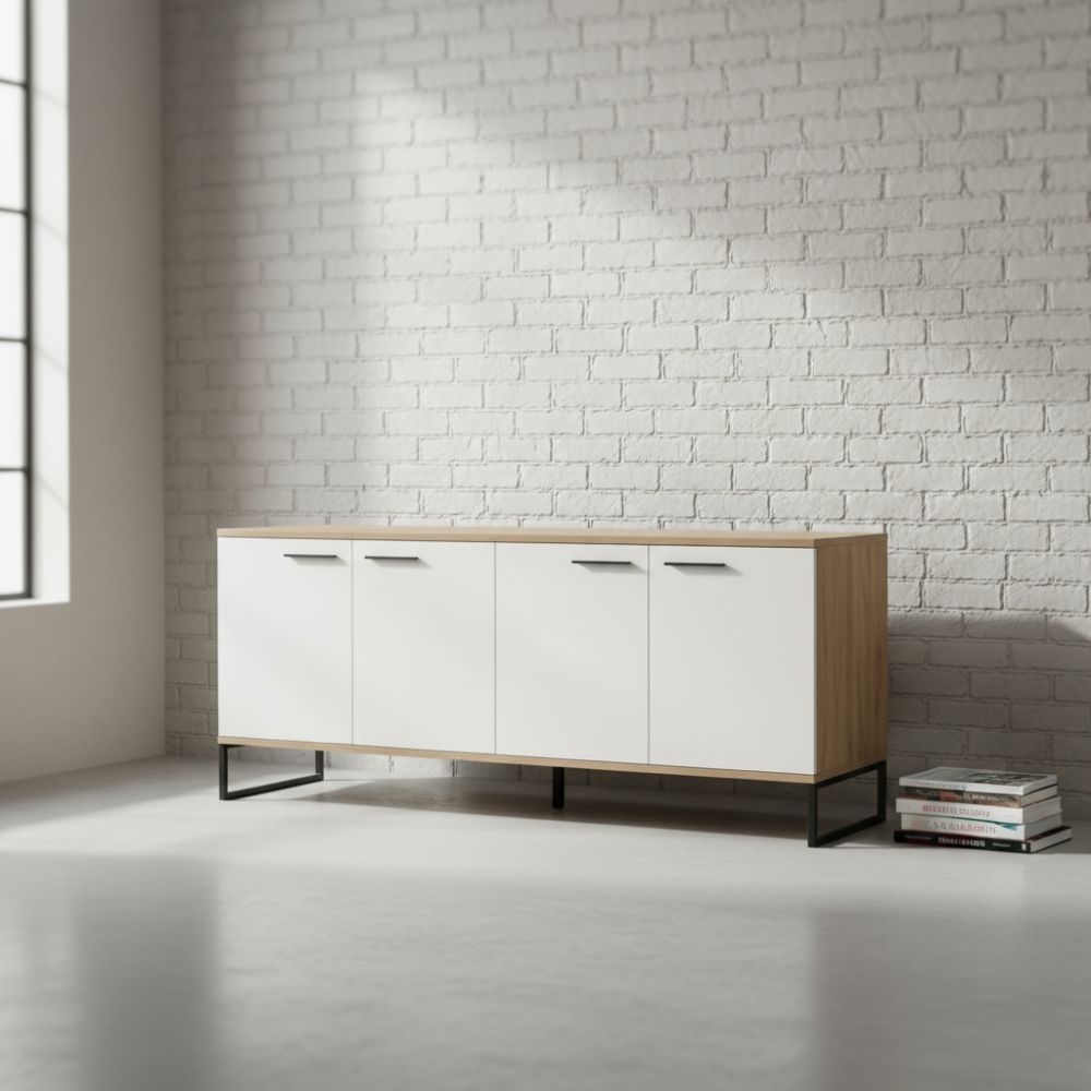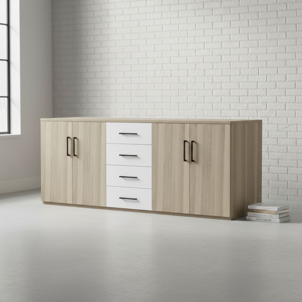 The unit features 4 hinged doors with square D-handles and loop epoxy legs.