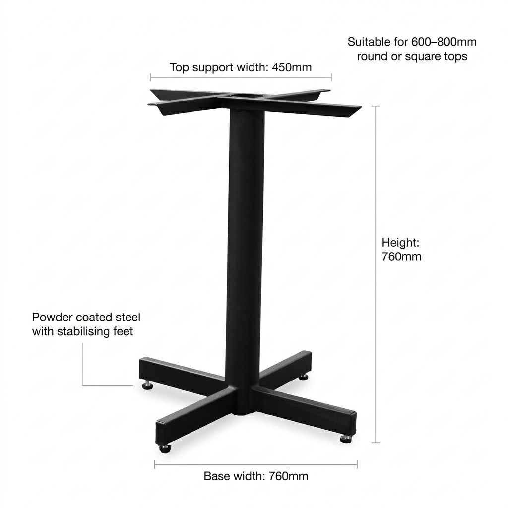 Previous Product Next Product Status Single Table Base Colour: Black Top Size: Maximum 800x800mm Table Height: 740mm Status Single Table Base quantity Add to Quote Category: Table Bases Brand: Mad Chair Company