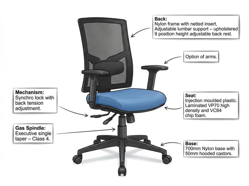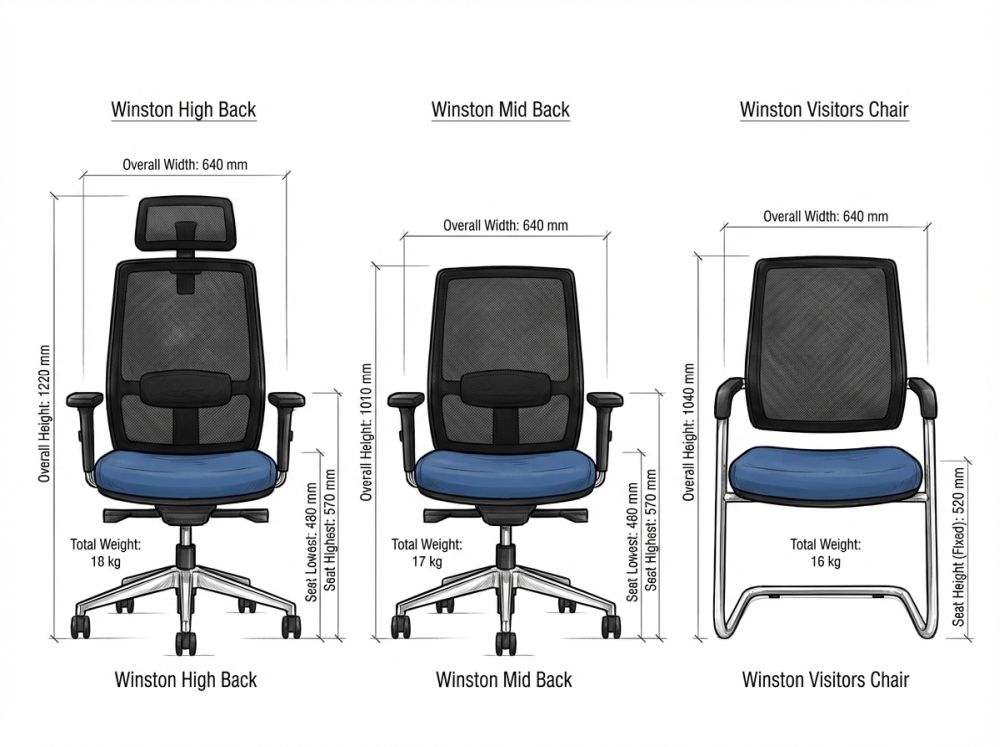 The Winston range is engineered for dependable performance in commercial environments. Its netted back reduces maintenance, while modular components allow dealers and project teams to adapt the chair to both budget and aesthetic needs.